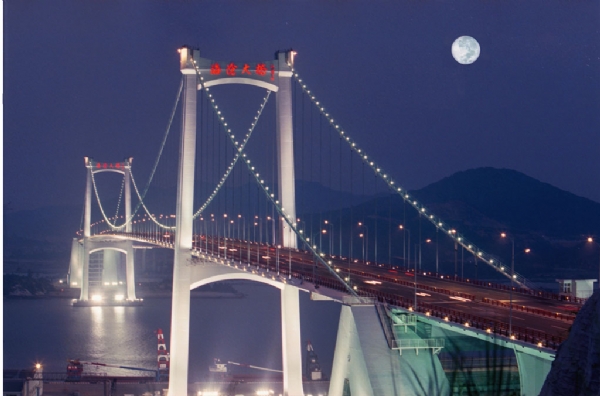 海滄大橋是由東渡互通立交東引橋、東航道橋、西航道橋、西引橋、石塘立交橋等大型工程組成的,全長(zhǎng)5926.572米,是我國(guó)自行設(shè)計(jì)、自己施工,且大部分材料是國(guó)產(chǎn)的。它的建成,代表著本世紀(jì)中國(guó)建橋水平最高成就。海滄大橋是亞洲第一、世界第二(僅次于丹麥)的三跨連續(xù)全漂浮鋼箱梁懸索橋。 纜索由上海浦江纜索股份有限公司提供(1997年) 返回