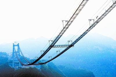 四渡河大橋全長1365米,由長1105米的大橋和長228.9米的路基組成。其中,大橋主跨為900米,橋面寬24.5米;大橋恩施岸索塔高118.2米,宜昌岸索塔高113.6米,塔頂至峽谷谷底高差達650米,被譽為世界第一高懸索橋。纜索由上海浦江纜索股份有限公司提供。 返回