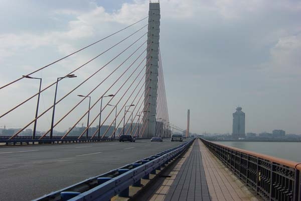 錢江三橋位于一橋二橋之間,總長為5700米。其中主橋長1280米,為雙獨塔等跨單索面斜拉橋與連續梁協作體系,橋面以上部分索塔高81米。每塔有15對斜拉索。錢江三橋在設計和施工中創造了多項國內橋梁建設之最。錢江三橋工程于1993年12月18日開工,1996年12月底建成。斜拉索由上海浦江纜索股份有限公司生產。 返回